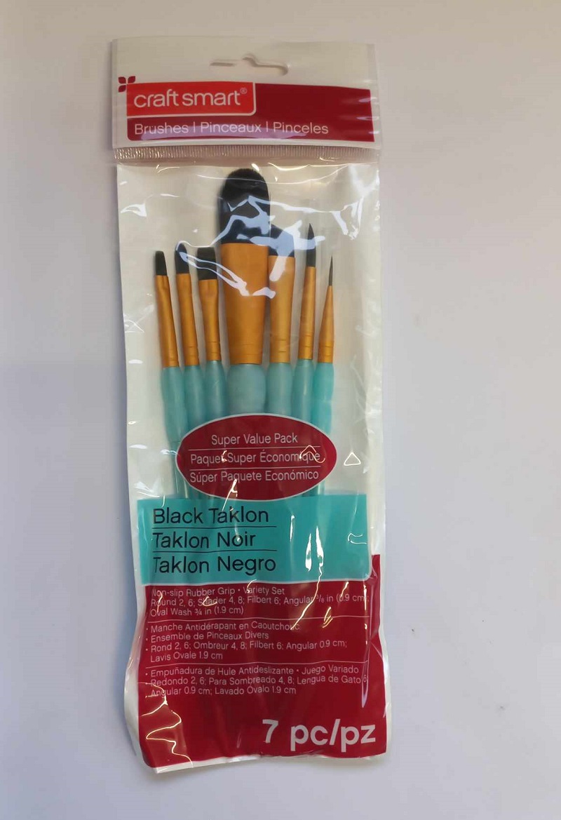 Black Taklon, super value pack. The Taklon paintbrushes offer a variety of options to tackle all your painting and crafting projects. The durable, polymer handles feature a no-slip rubber grip for added comfort. This set includes 7 quality, variety paintbrushes with black taklon bristles. Suitable for oil, acrylic, watercolour and tempera paints.
