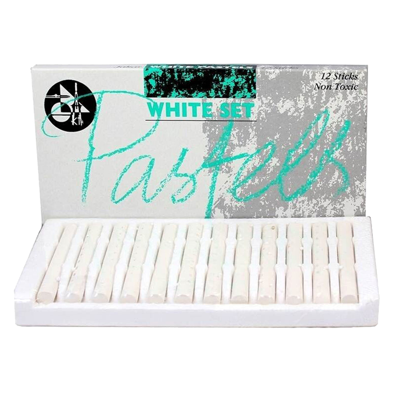Set of 12 White Pastel Sticks. The sticks are packaged in a polystyrene tray that is cellophane wrapped and finished with a cardboard sleeve. Made to a non toxic formula