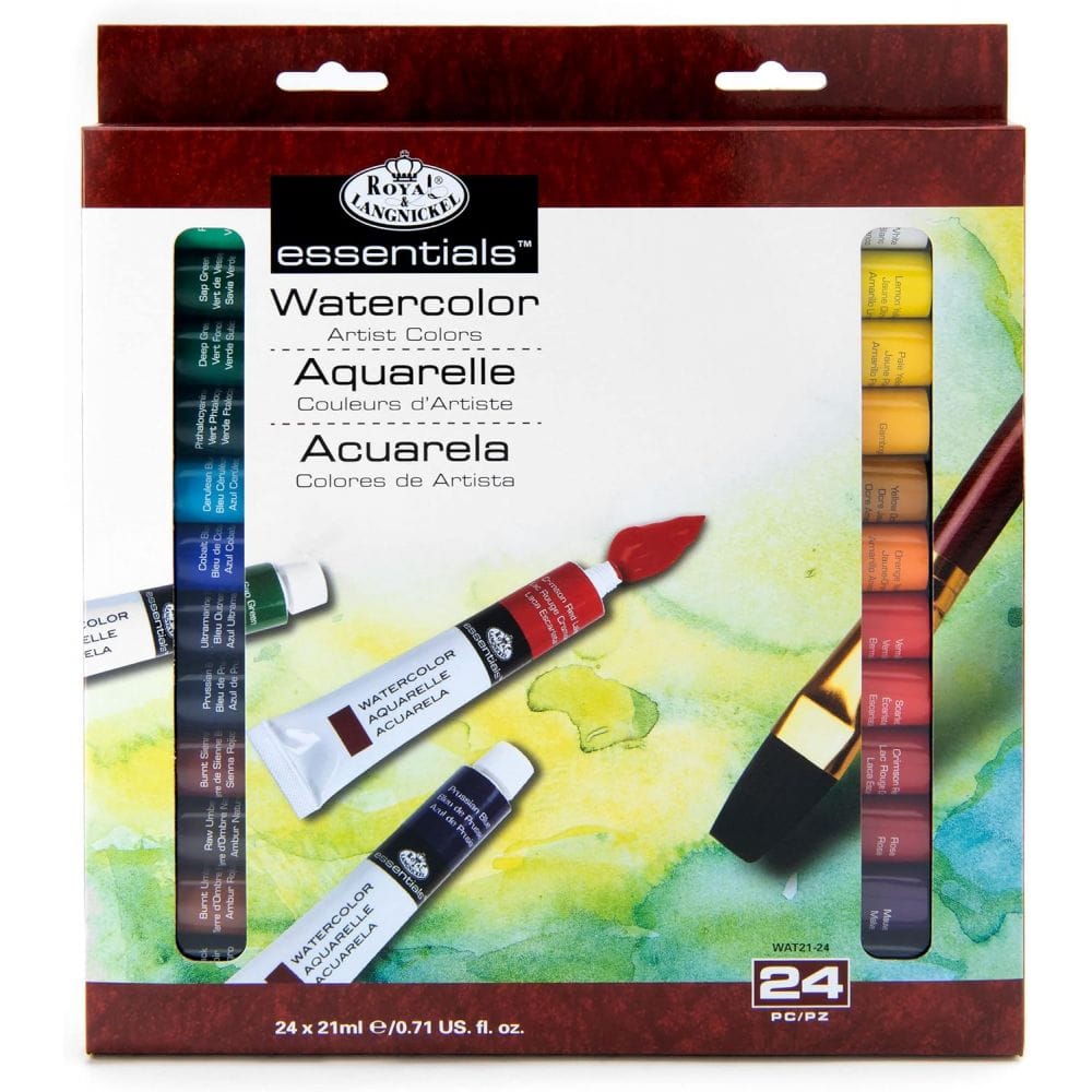 24 assorted colours of 21ml tubes of high quality student grade paint. Royal essentials high quality pigment paints have a smooth full body and uniform consistency. The set is presented in a cardboard-sleeved gift box, which makes it an ideal gift for any experienced or budding artist. Royal & Langnickel watercolour has a good light fastness and permanence; gives smooth consistant colour washes and is for use on watercolour paper.
